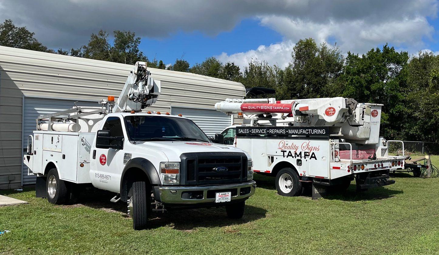 Dedicated In-House Installation Crew: Your sign is installed by our own team—experienced, professional technicians who work for Quality Signs Tampa. This means the people who install your sign are the same people who know exactly how it was fabricated and what it takes to mount it perfectly and safely. Fully Equipped Fleet: We maintain a complete fleet of installation vehicles, including crane and bucket trucks, specifically equipped for all types of large-scale and high-reach commercial sign projects. This means we control the schedule, the equipment, and the quality, ensuring your installation is completed efficiently and on time. Licensed Sign Contractor: We are a fully licensed and insured sign contractor. This critical credential gives you peace of mind, assuring that all work adheres to local codes, safety regulations, and industry best practices. Don't risk your project with an unlicensed vendor—our full insurance coverage protects you and your business from start to finish. Zero Subcontracting: We eliminate the risks and added costs associated with subcontracting. By never farming out the work, we cut out the middle-man, which allows us to provide shorter lead times and the most competitive prices on your complete sign package—from design and fabrication to final installation. Trust the experts at Quality Signs Tampa to not only manufacture a beautiful, high-quality sign but to also install it flawlessly, safely, and legally. Our dedicated crew and fleet are ready to get your business noticed.